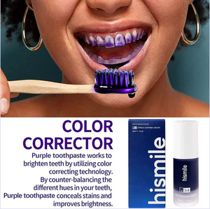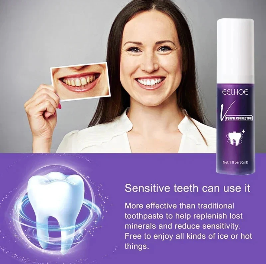 A revolutionary purple color-correcting toothpaste designed to neutralize yellow tones, brighten your smile, and freshen your breath — all without irritation. Perfect for coffee and tea lovers or anyone looking to enhance their natural white.